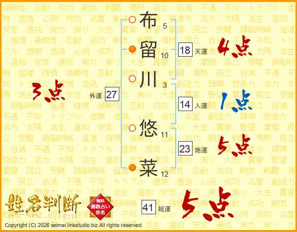 布(5画)留(10画)川(3画) 悠(11画)菜(12画)