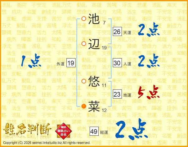 池(7画)辺(19画) 悠(11画)菜(12画)