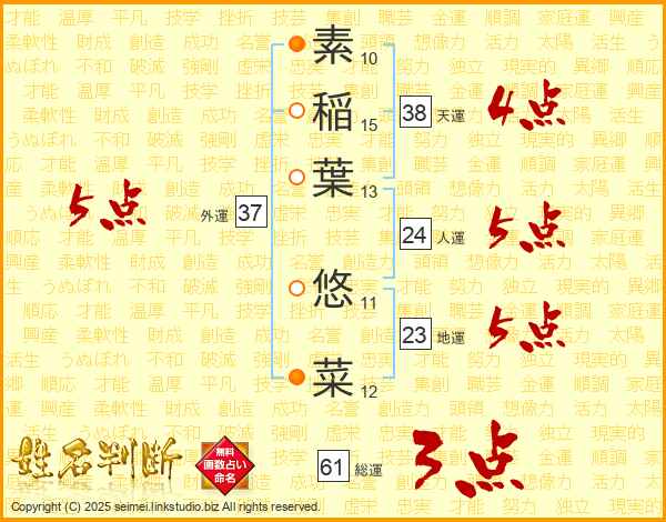 素(10画)稲(15画)葉(13画) 悠(11画)菜(12画)