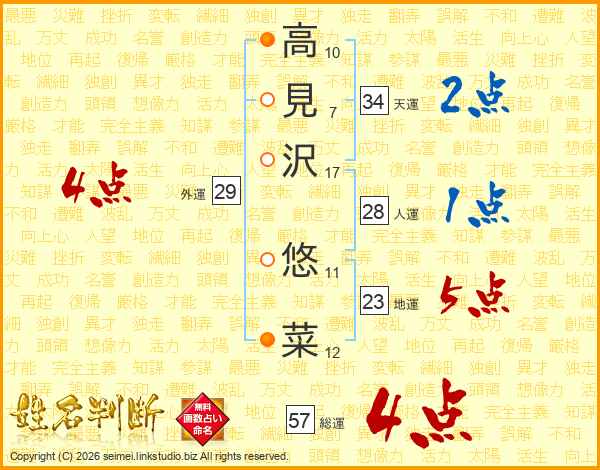 高(10画)見(7画)沢(17画) 悠(11画)菜(12画)