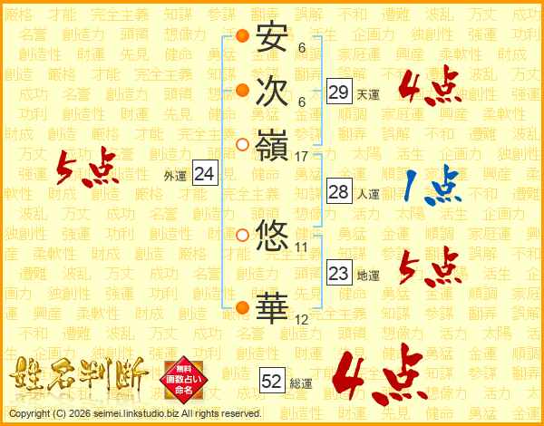 安(6画)次(6画)嶺(17画) 悠(11画)華(12画)