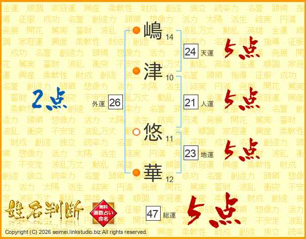 嶋(14画)津(10画) 悠(11画)華(12画)