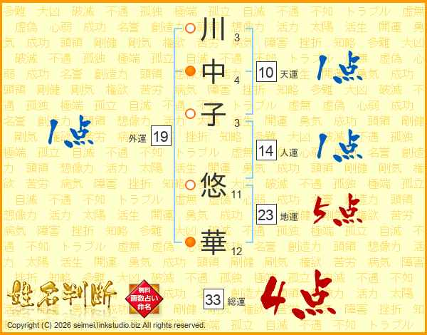 川(3画)中(4画)子(3画) 悠(11画)華(12画)