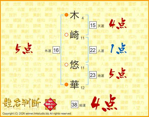 木(4画)崎(11画) 悠(11画)華(12画)