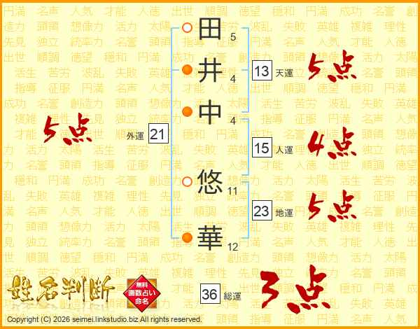 田(5画)井(4画)中(4画) 悠(11画)華(12画)
