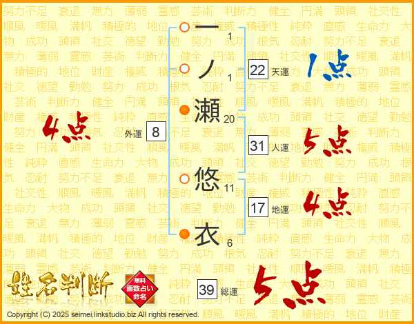 一(1画)ノ(1画)瀬(20画) 悠(11画)衣(6画)