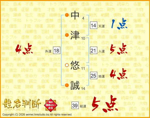 中(4画)津(10画) 悠(11画)誠(14画)