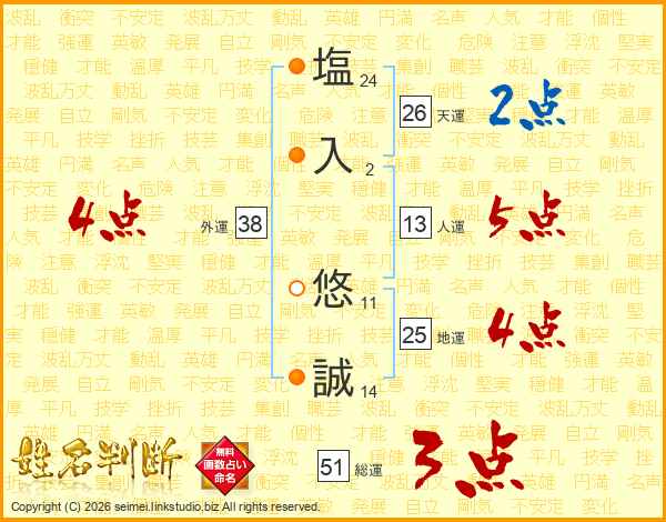 塩(24画)入(2画) 悠(11画)誠(14画)