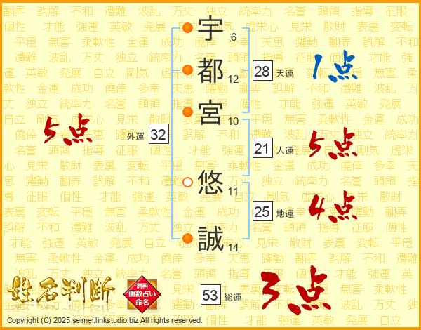 宇(6画)都(12画)宮(10画) 悠(11画)誠(14画)