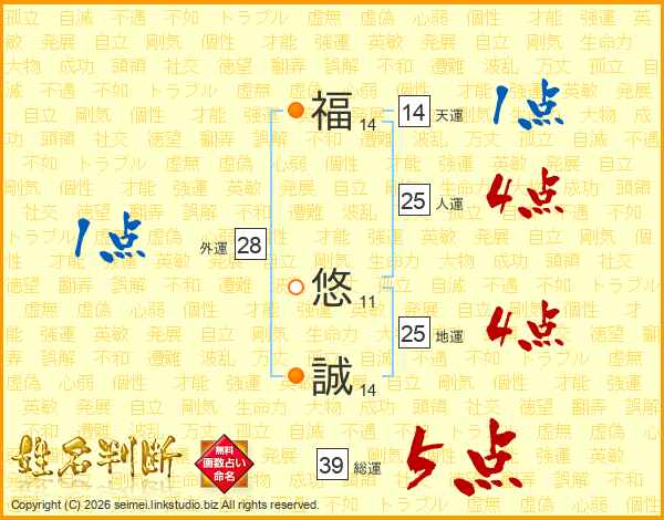 福(14画) 悠(11画)誠(14画)