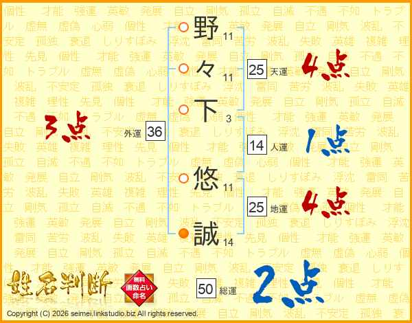野(11画)々(11画)下(3画) 悠(11画)誠(14画)