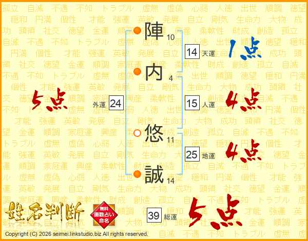 陣(10画)内(4画) 悠(11画)誠(14画)