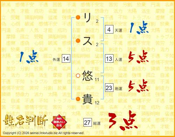 リ(2画)ス(2画) 悠(11画)貴(12画)