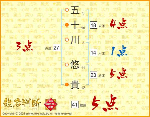 五(5画)十(10画)川(3画) 悠(11画)貴(12画)