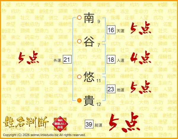 南(9画)谷(7画) 悠(11画)貴(12画)