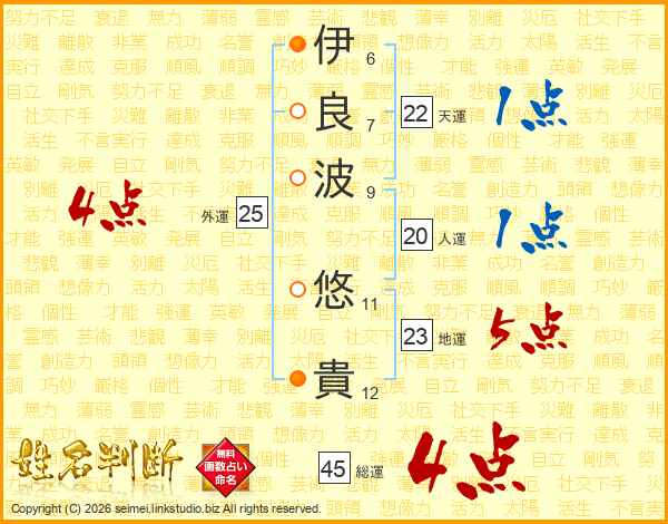 伊(6画)良(7画)波(9画) 悠(11画)貴(12画)