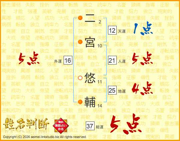 二(2画)宮(10画) 悠(11画)輔(14画)