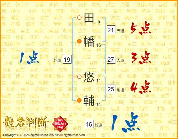 田(5画)幡(16画) 悠(11画)輔(14画)