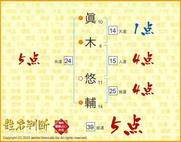 眞(10画)木(4画) 悠(11画)輔(14画)