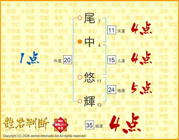 尾(7画)中(4画) 悠(11画)輝(13画)