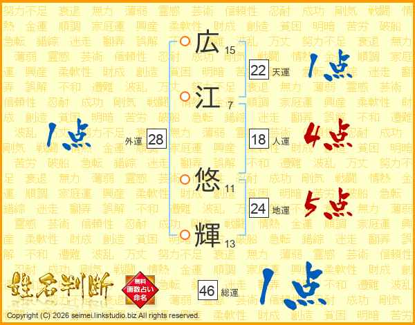 広江悠輝さんの総運は46画の1点!