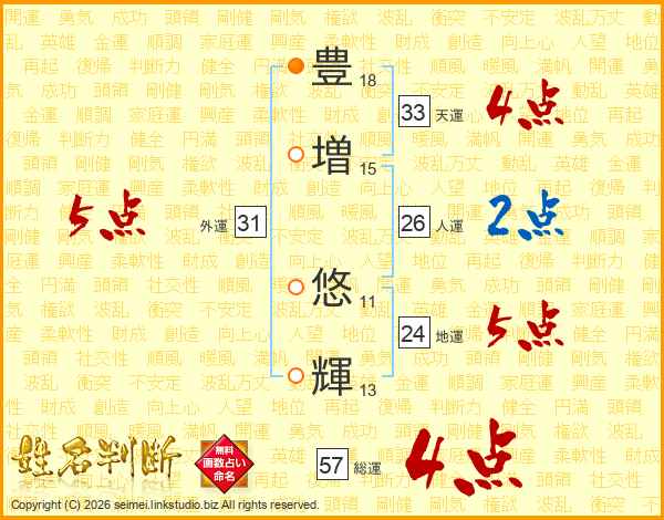 豊(18画)増(15画) 悠(11画)輝(13画)