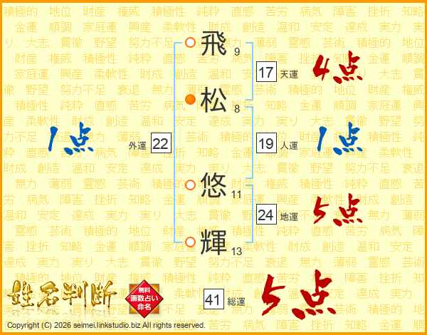 飛(9画)松(8画) 悠(11画)輝(13画)
