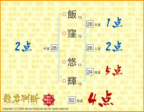飯(13画)窪(15画) 悠(11画)輝(13画)