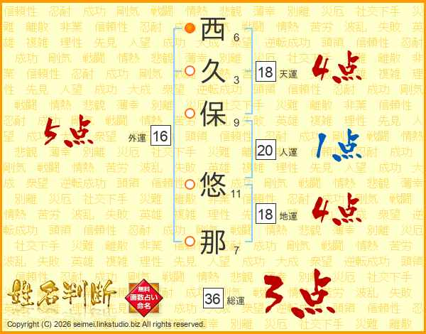 西(6画)久(3画)保(9画) 悠(11画)那(7画)