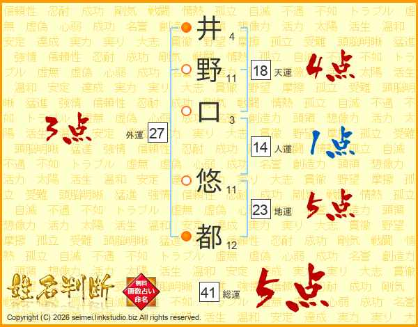 井(4画)野(11画)口(3画) 悠(11画)都(12画)