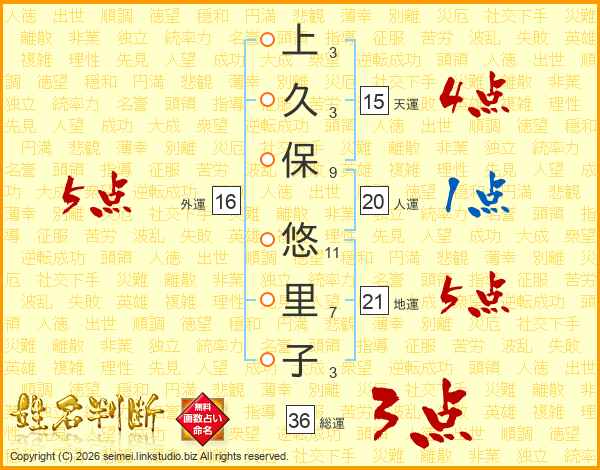 上(3画)久(3画)保(9画) 悠(11画)里(7画)子(3画)