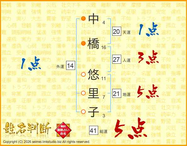 中(4画)橋(16画) 悠(11画)里(7画)子(3画)