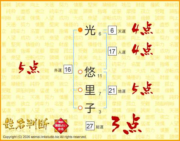 光(6画) 悠(11画)里(7画)子(3画)