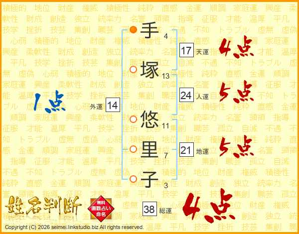 手塚悠里子さんの総運は38画の4点!