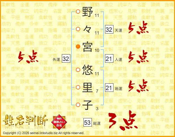 野(11画)々(11画)宮(10画) 悠(11画)里(7画)子(3画)