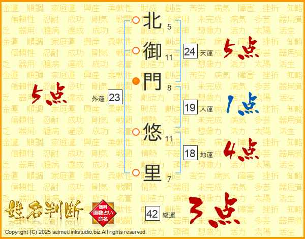 北(5画)御(11画)門(8画) 悠(11画)里(7画)