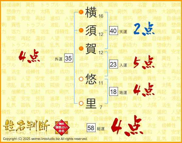横(16画)須(12画)賀(12画) 悠(11画)里(7画)