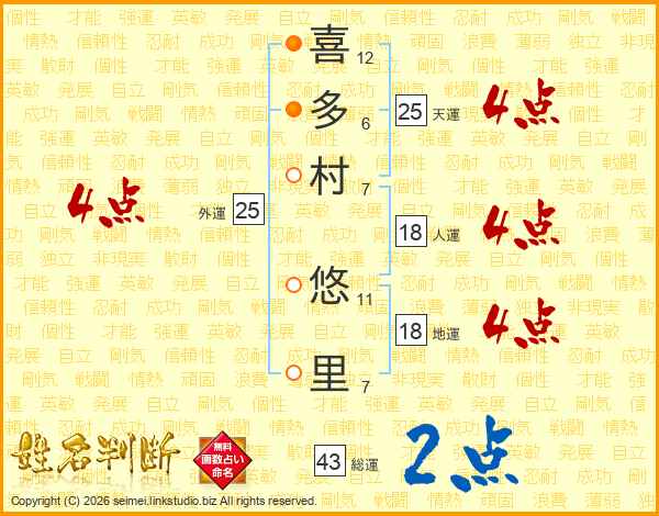 喜(12画)多(6画)村(7画) 悠(11画)里(7画)
