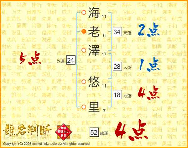 海(11画)老(6画)澤(17画) 悠(11画)里(7画)