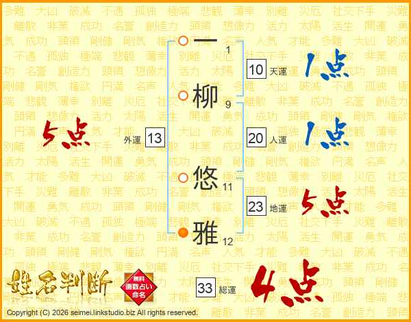 一(1画)柳(9画) 悠(11画)雅(12画)