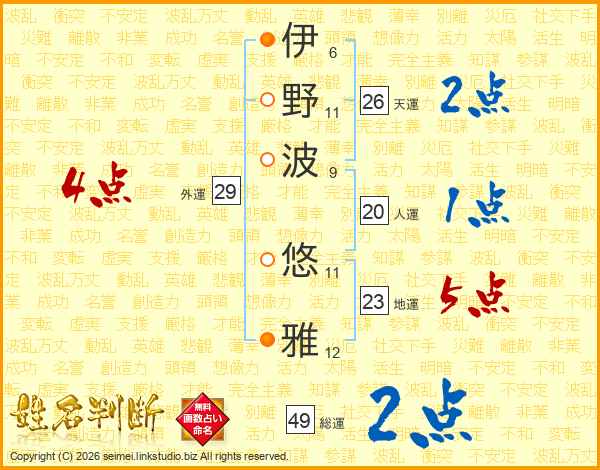 伊(6画)野(11画)波(9画) 悠(11画)雅(12画)