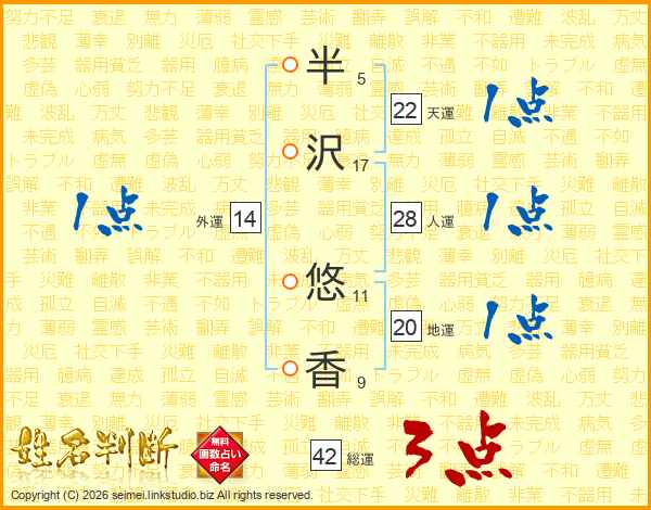半(5画)沢(17画) 悠(11画)香(9画)