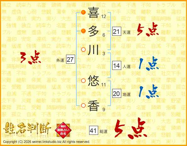 喜(12画)多(6画)川(3画) 悠(11画)香(9画)