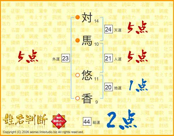 対(14画)馬(10画) 悠(11画)香(9画)