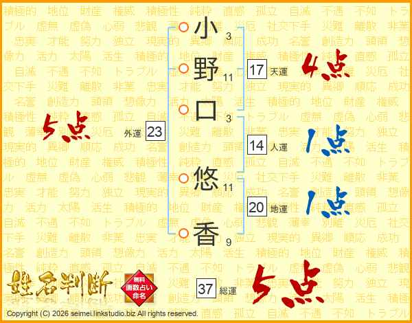 小(3画)野(11画)口(3画) 悠(11画)香(9画)