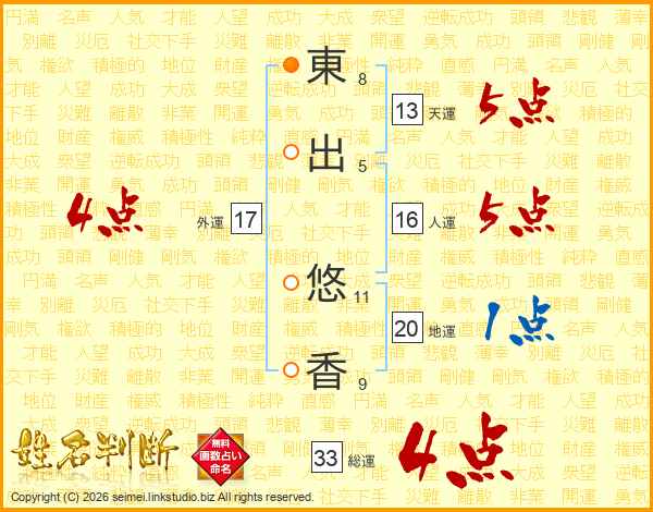 生活面を象徴する運勢です。外部から受ける影響力を表し、結婚運、家庭運や職場、環境への順応性を表します。総運から人運を引いた画数。姓や名が1文字の場合を除く。
