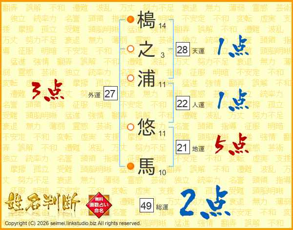 槝(14画)之(3画)浦(11画) 悠(11画)馬(10画)