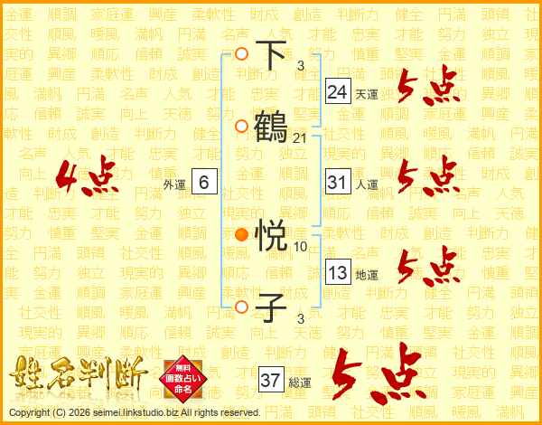 下(3画)鶴(21画) 悦(10画)子(3画)