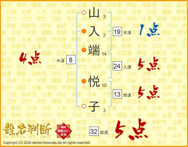 山(3画)入(2画)端(14画) 悦(10画)子(3画)