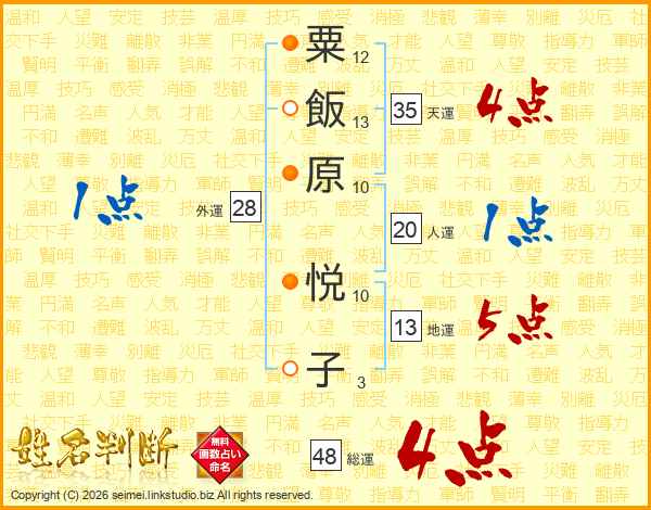 粟(12画)飯(13画)原(10画) 悦(10画)子(3画)